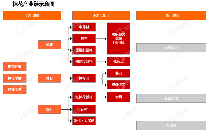 我国长绒棉产业链中,上游为棉花种植业,主要产地为新疆;中游为棉花制造业,主要包括轧花厂、流通商、纺织企业、服装加工商等四个主体;下游为具体应用和消费者。