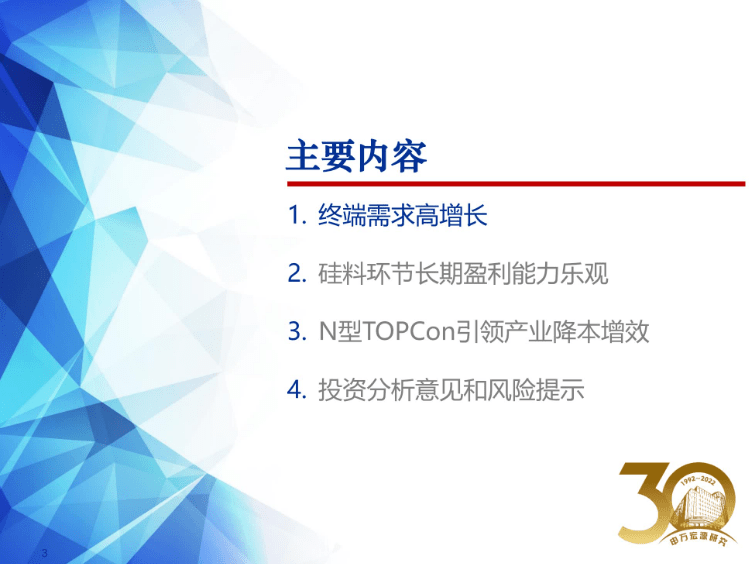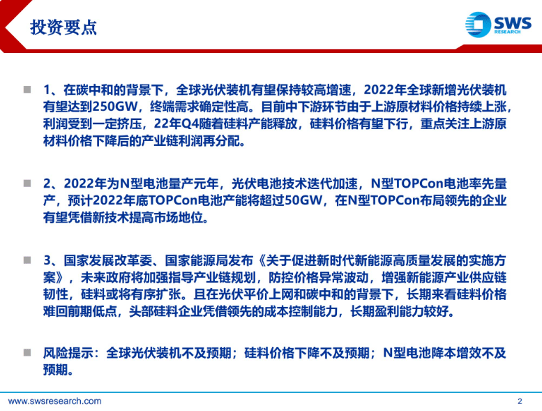 在碳中和的背景下,全球光伏装机有望保持较高增速,2022年全球新增光伏装机有望达到250GW,终端需求确定性高。目前中下游环节由于上游原材料价格持续上涨,利润受到一定挤压,22年Q4随着硅料产能释放,硅料价格有望下行,重点关注上游原材料价格下降后的产业链利润再分配。